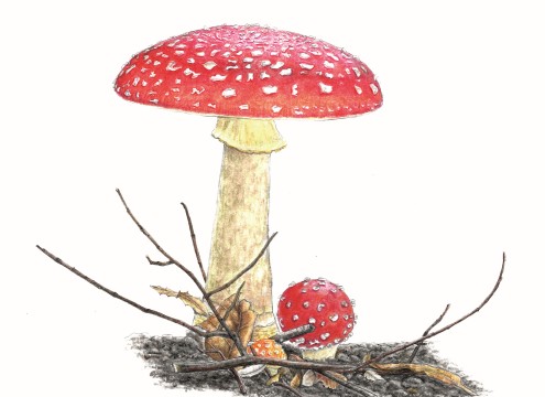 Vliegenzwam in kleurpotlood